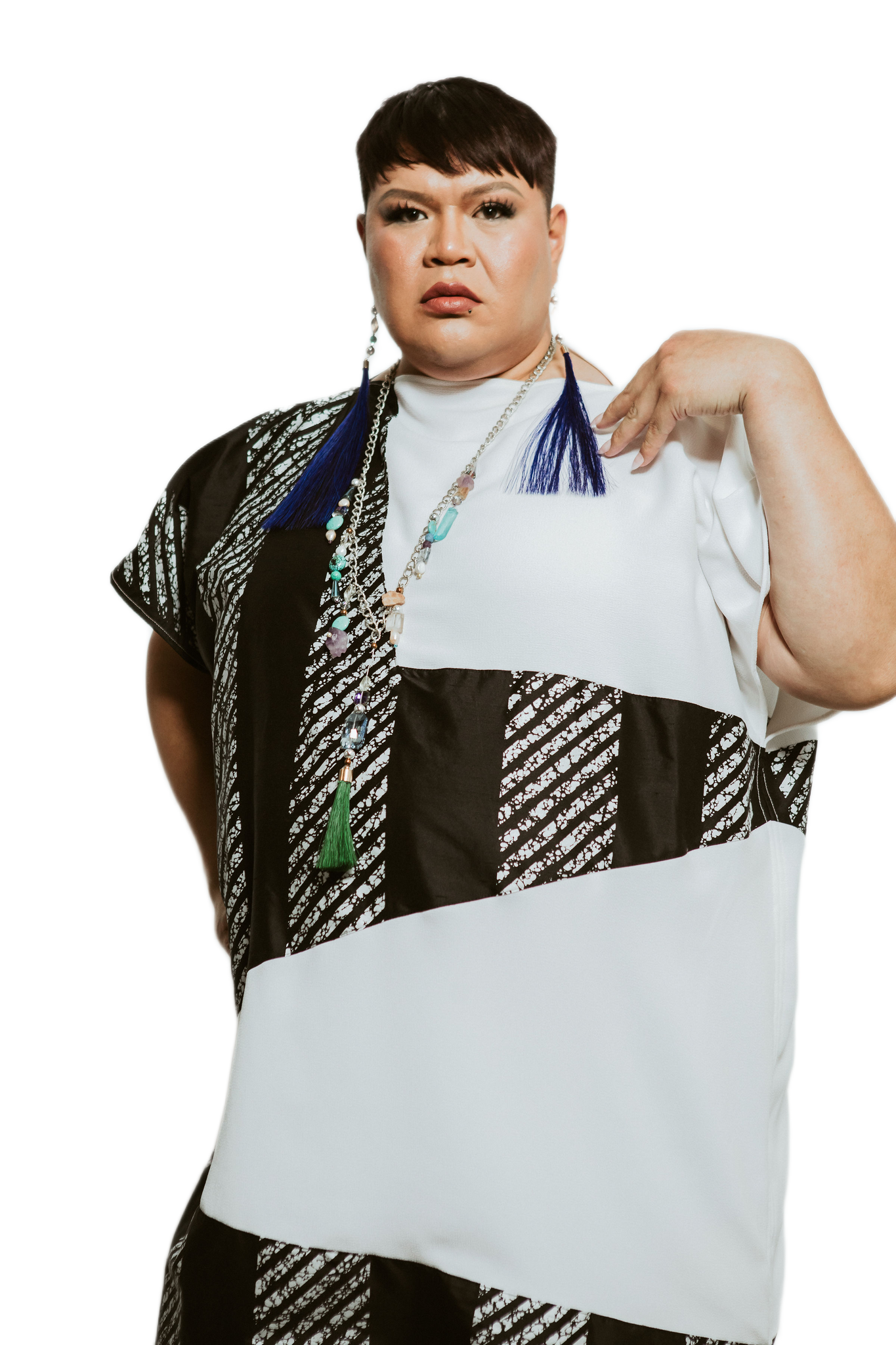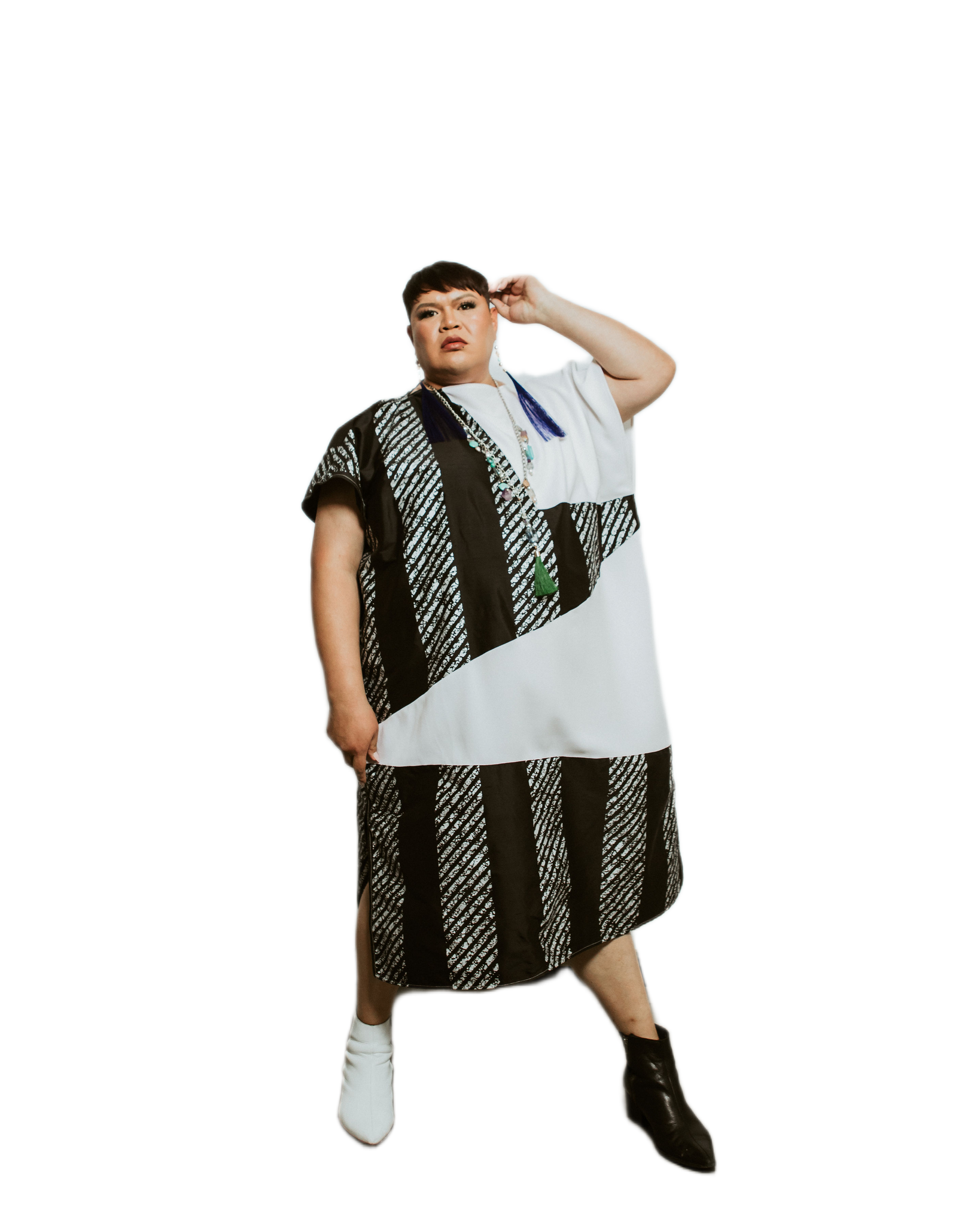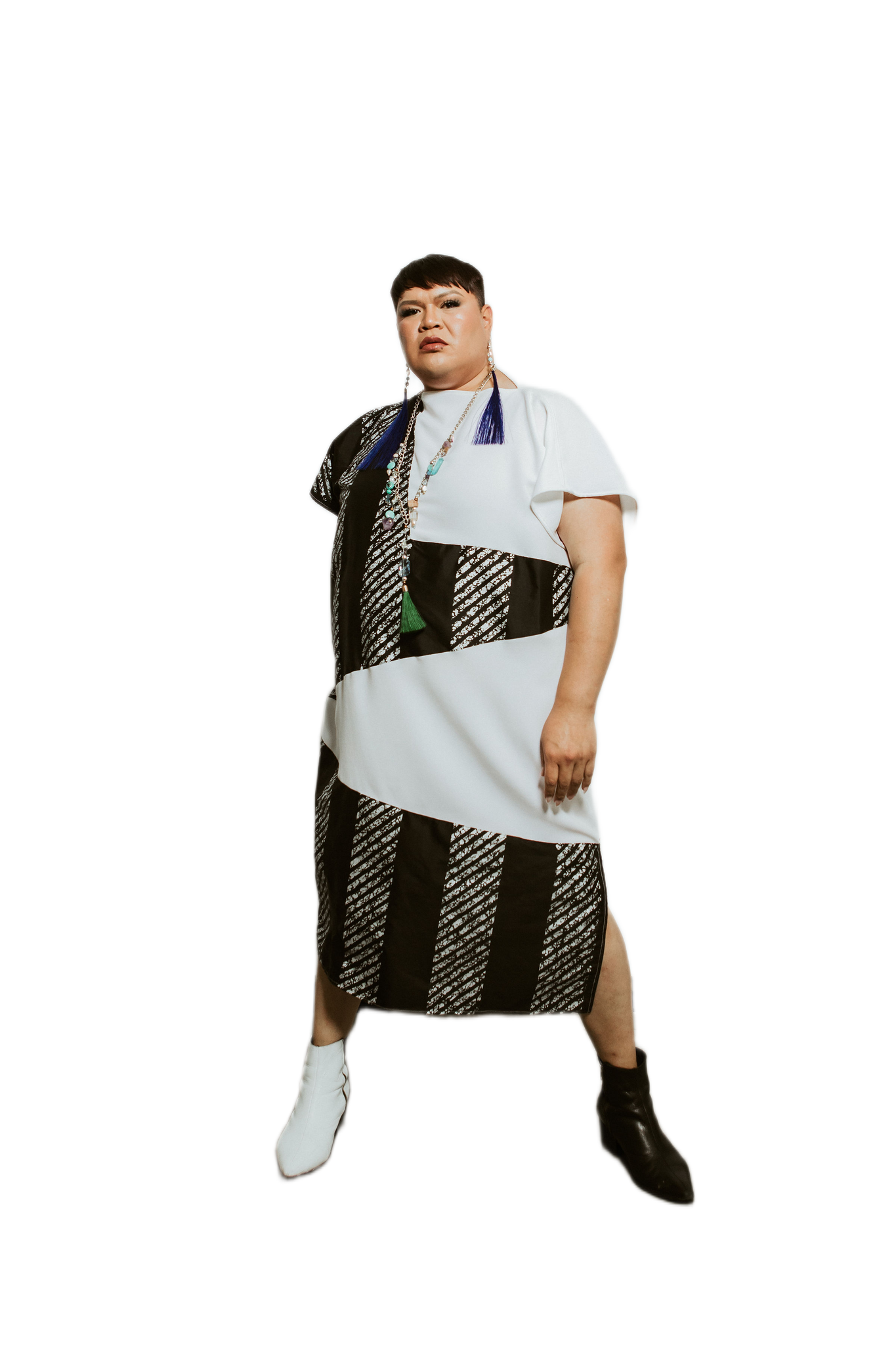 Short-sleeve midi dress in contrasting black silk jacquard and white silk panels. features diagonal and vertical paneling for a graphic, modern look, with side slits for ease of movement.