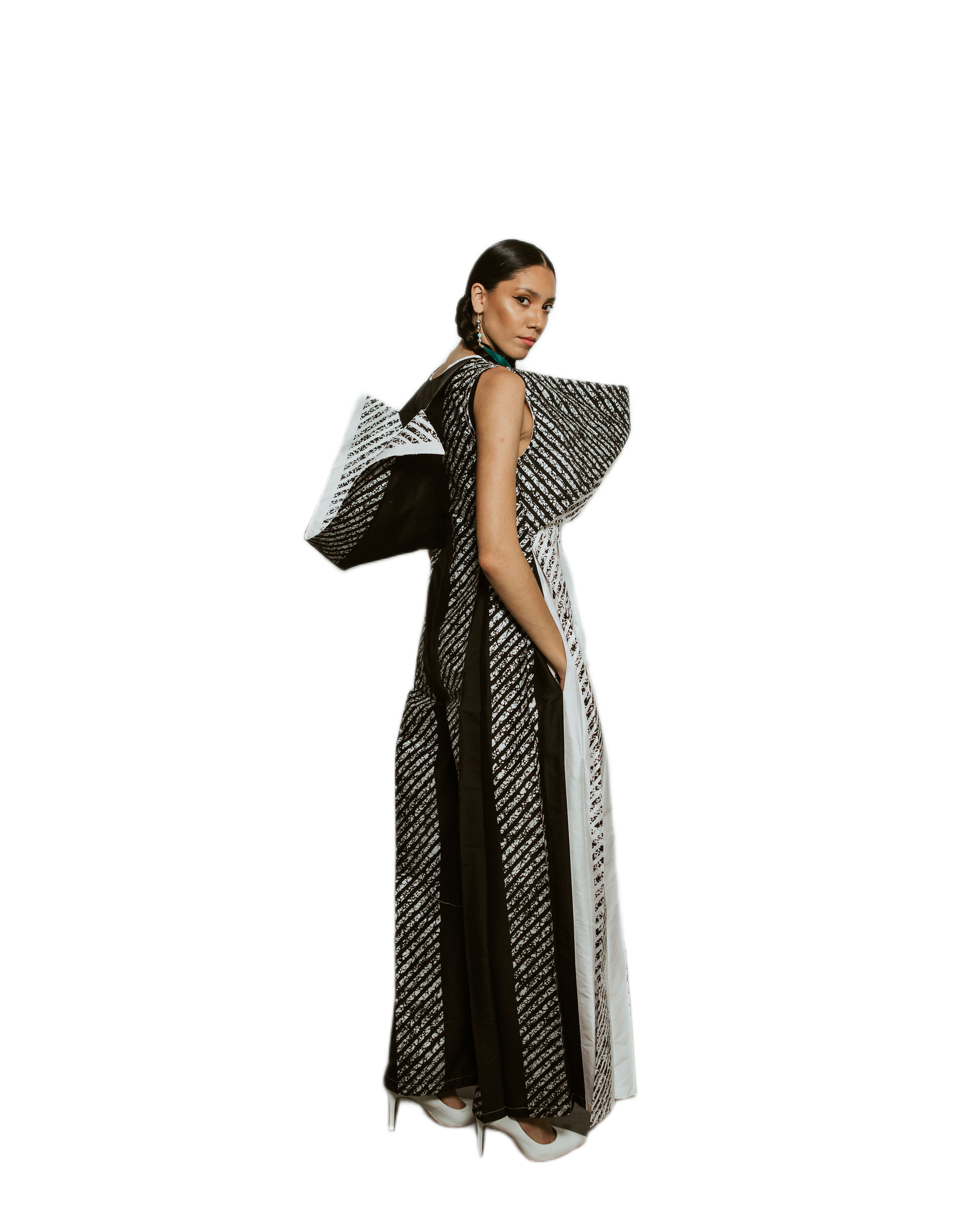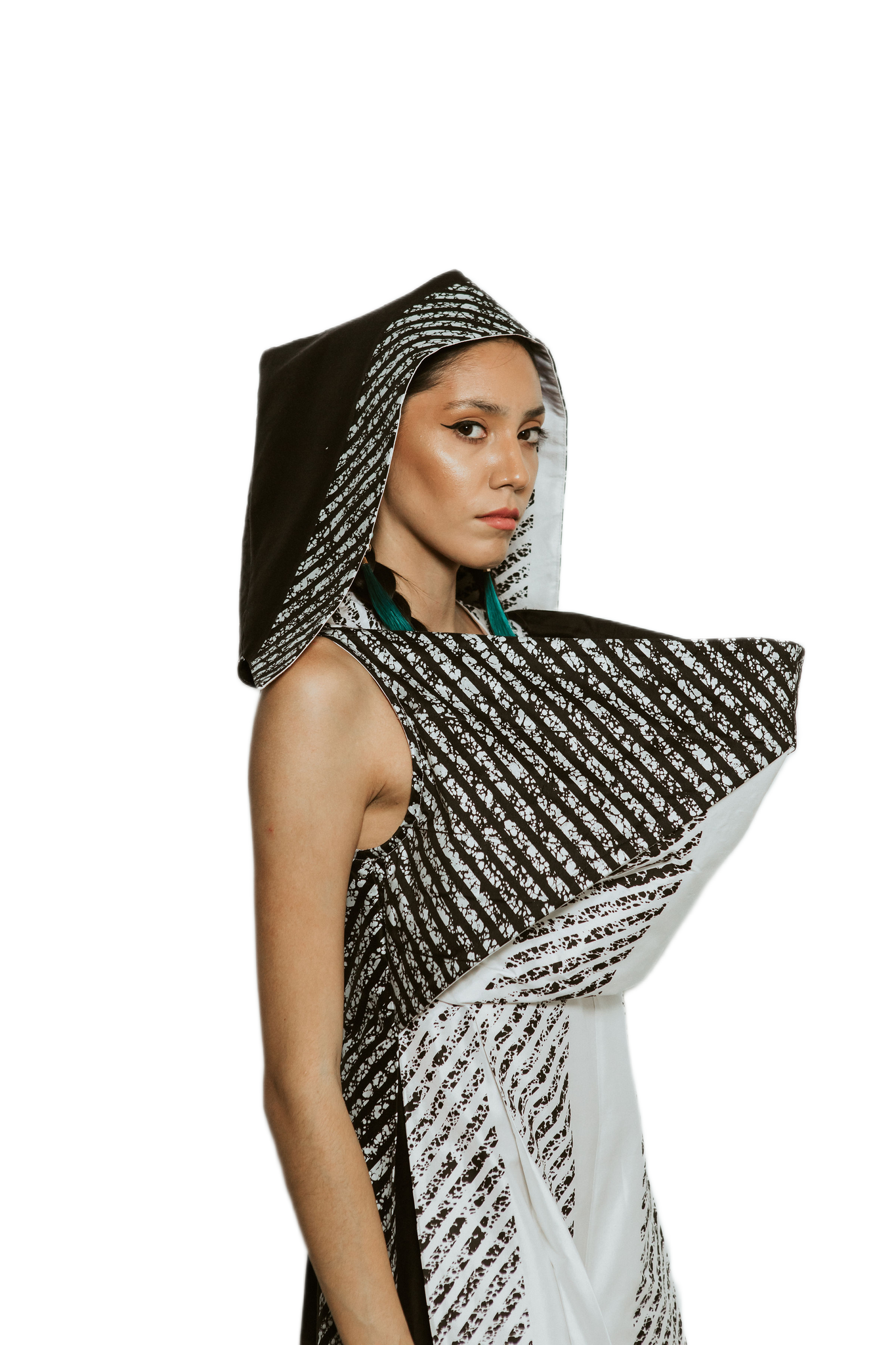 Sleeveless full-length jumpsuit in black and white silk jacquard, featuring bold diagonal stripe panels and a dramatic sculptural collar that extends over the shoulder. includes an integrated hood for versatile styling. the structured bodice flows into a straight-line silhouette with hidden side pockets.