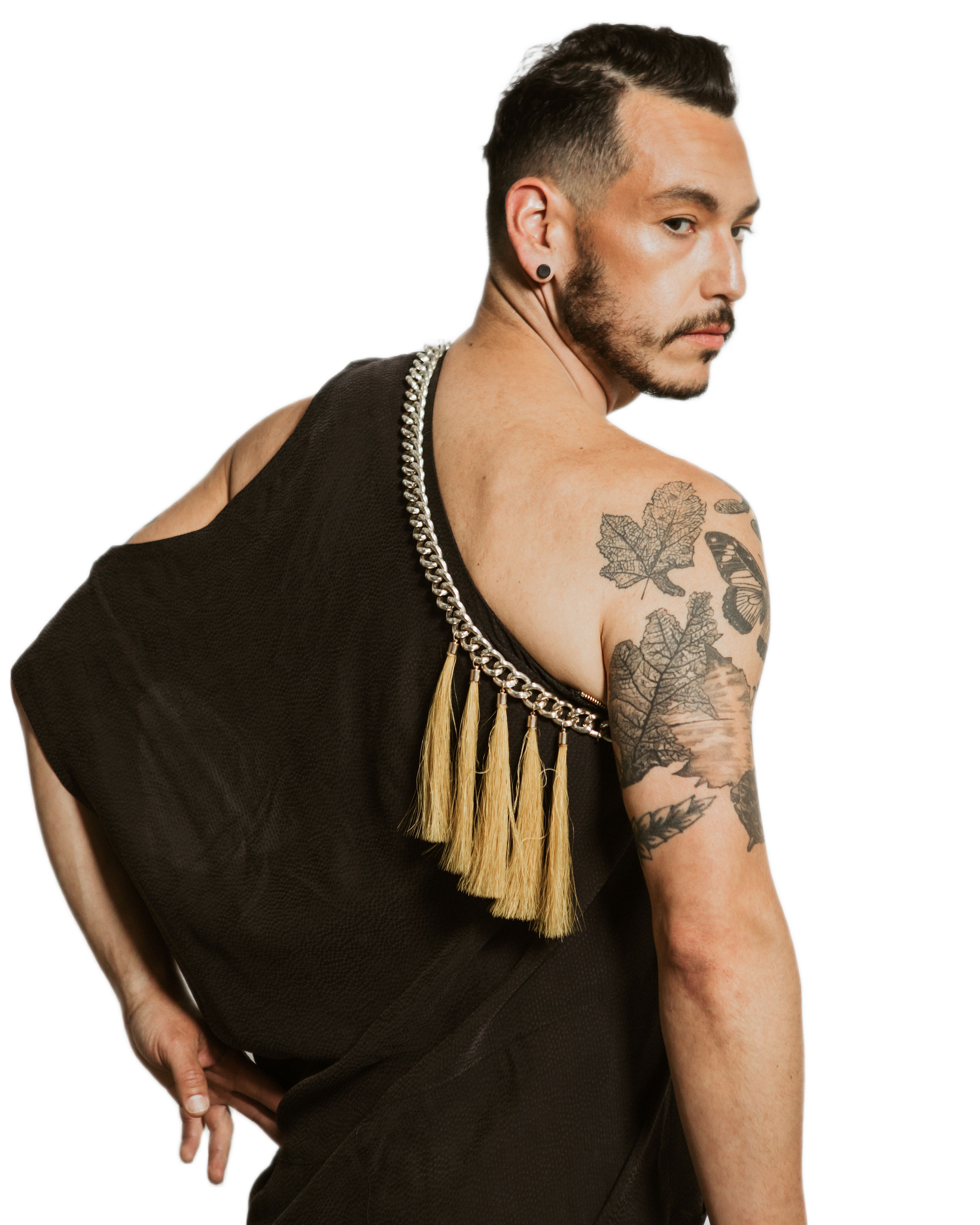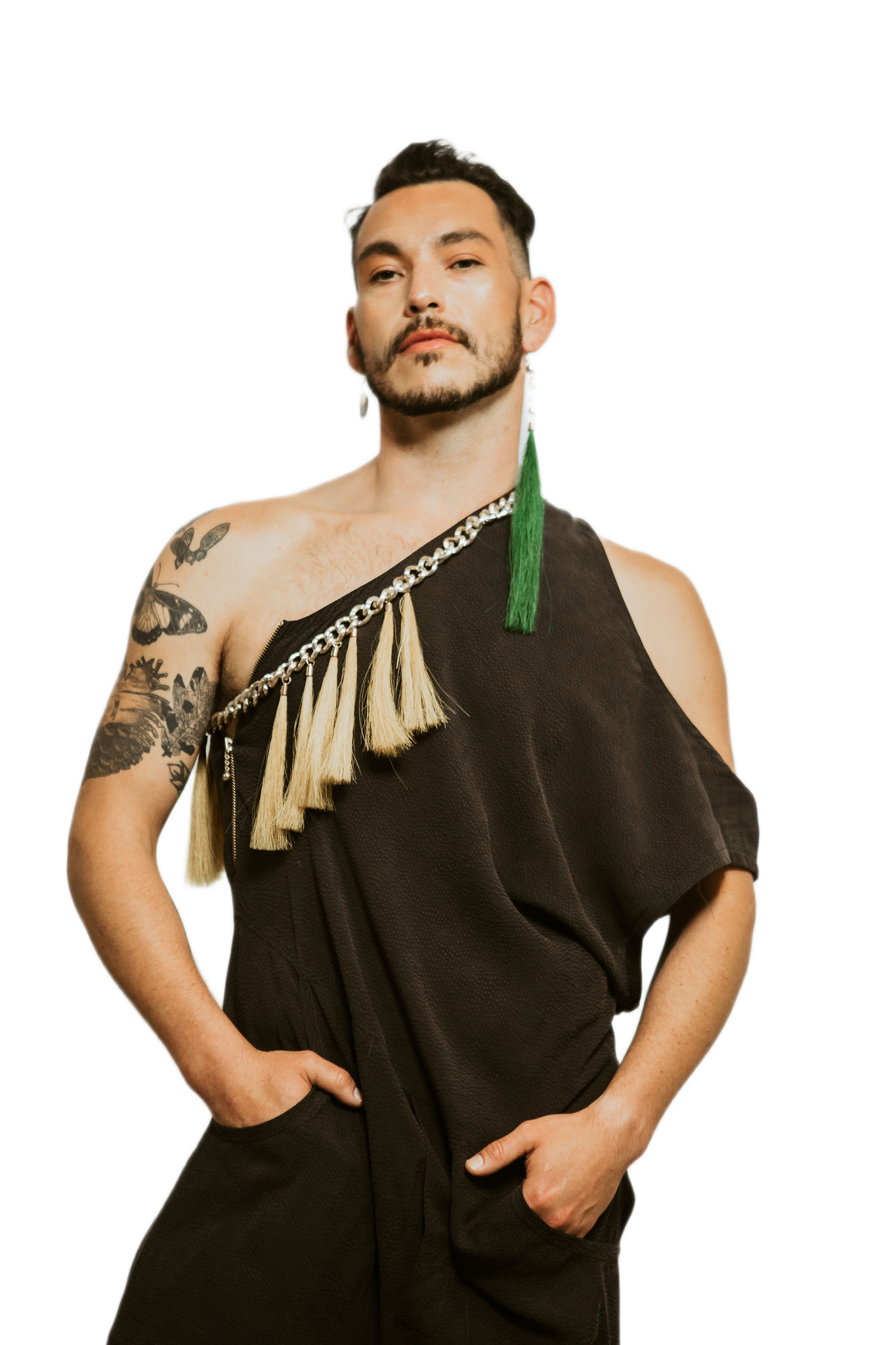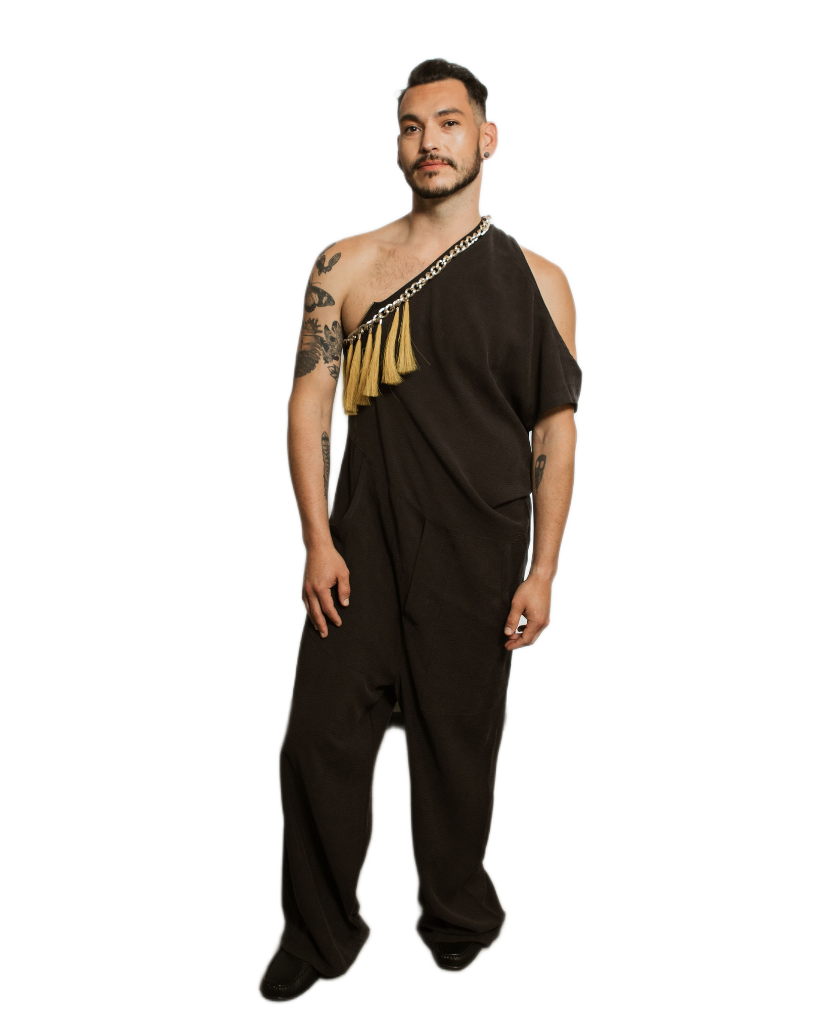Asymmetric one-shoulder jumpsuit in a charcoal fabric, featuring a draped, relaxed fit with wide legs and side pockets. detailed with a statement braided chain across the neckline, adorned with natural tassels for a bold, tactile accent.