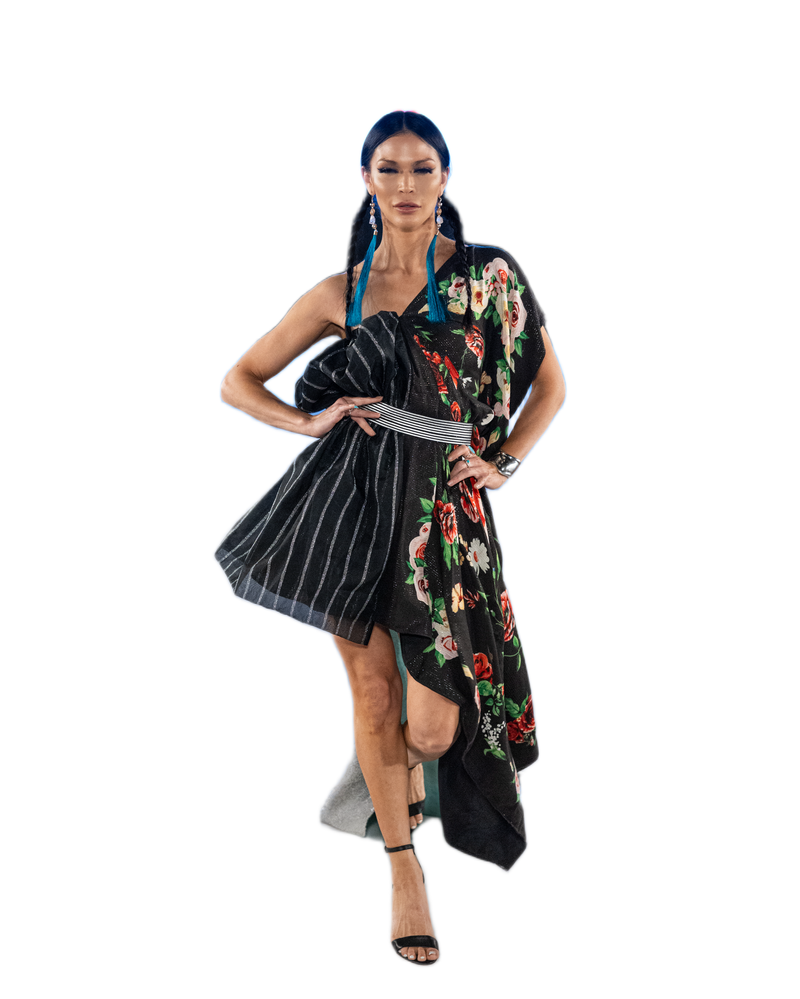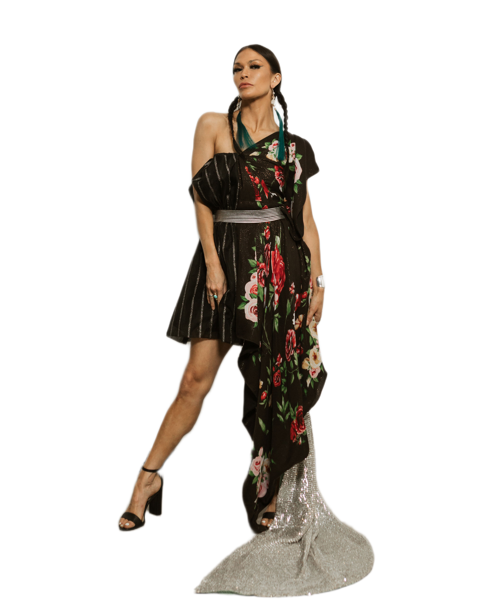 Asymmetric one-shoulder dress in contrasting floral jacquard silk and fine pinstripe wool-blend panels. features a sculptural draped silhouette with gathered detailing at the waist and a cascading side panel.