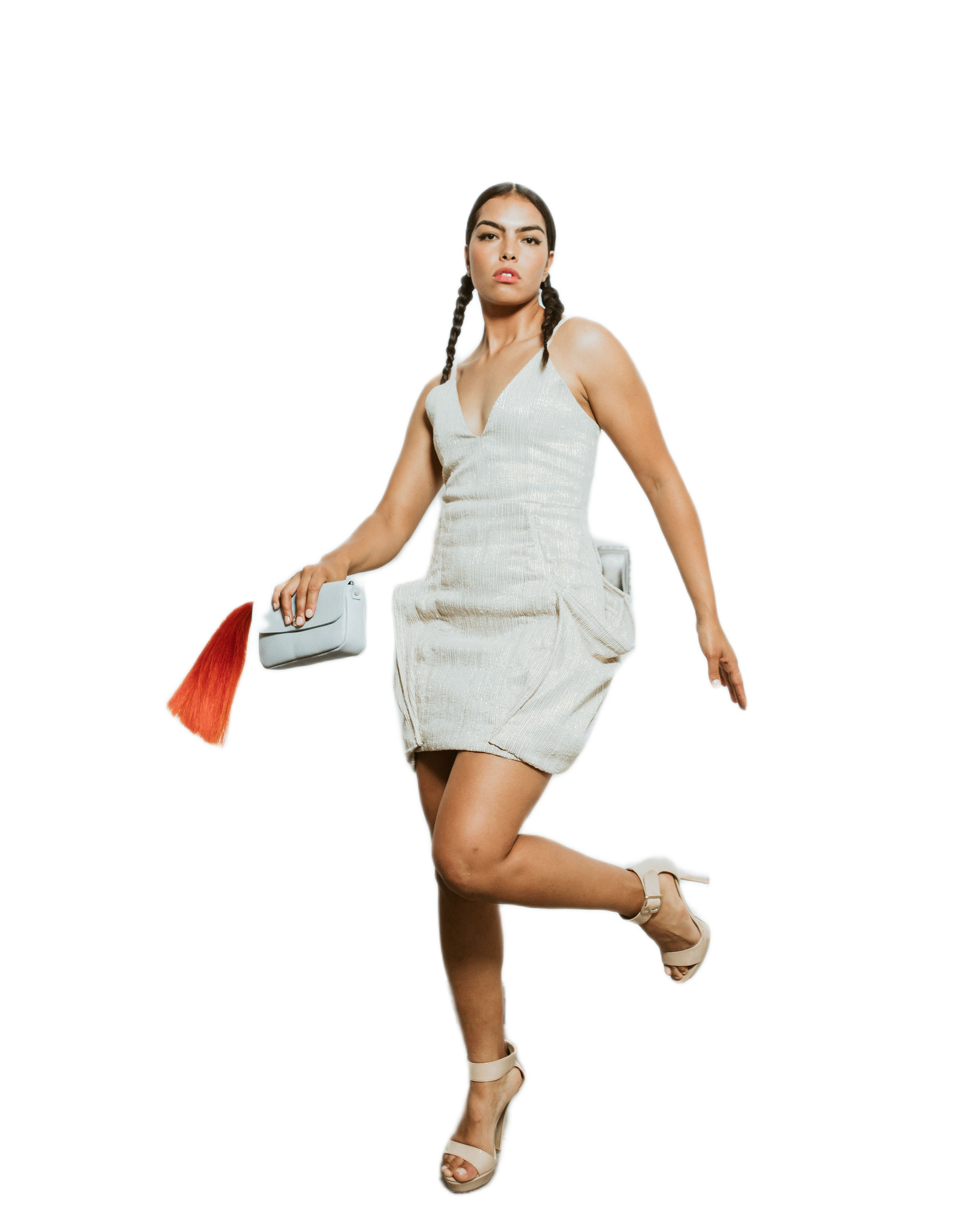 Sleeveless mini dress in ivory silk with a deep v-neckline, fitted bodice, and sculpted bubble hem. features side pockets integrated into the draped skirt panels for a modern, functional detail.