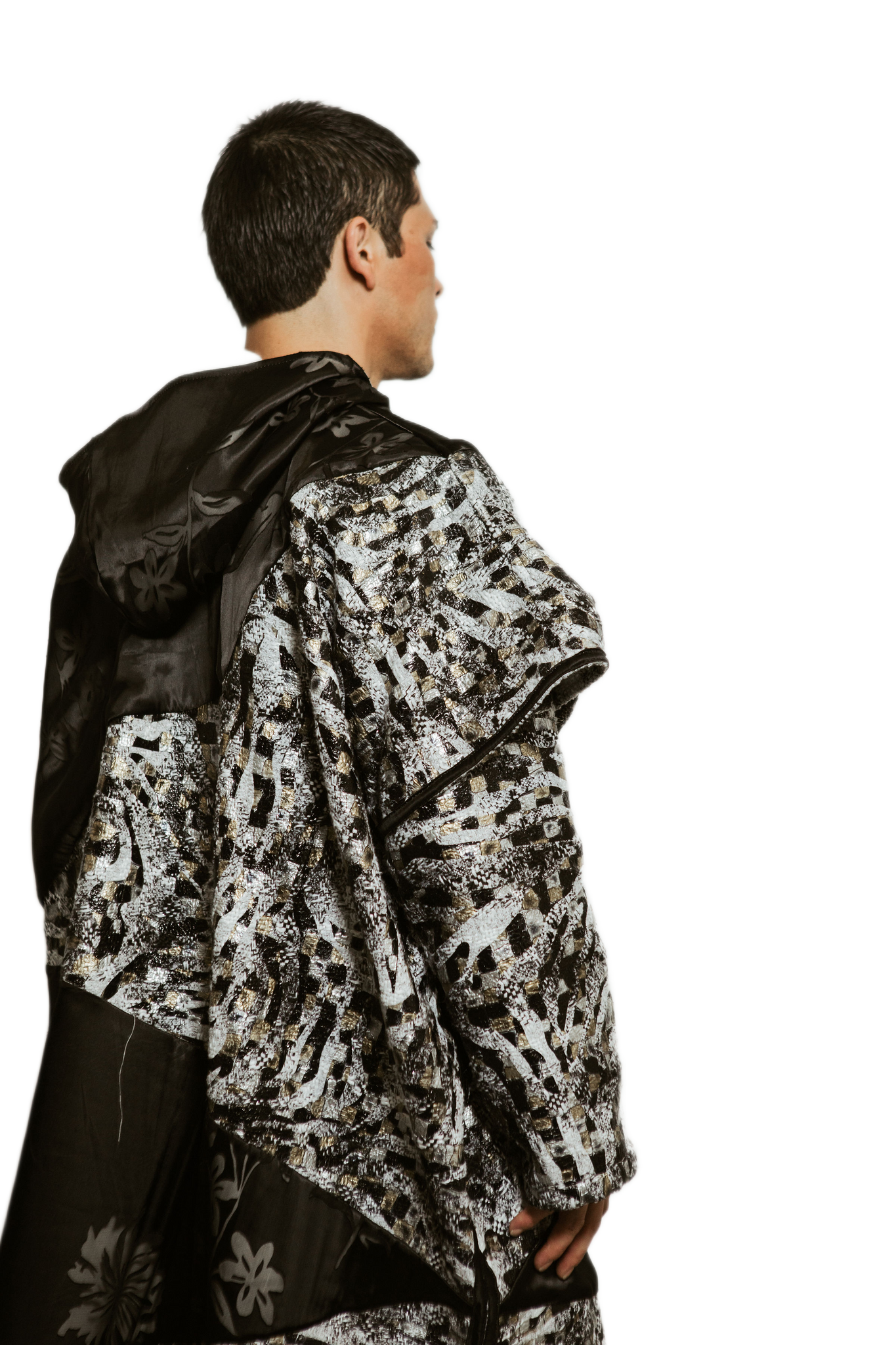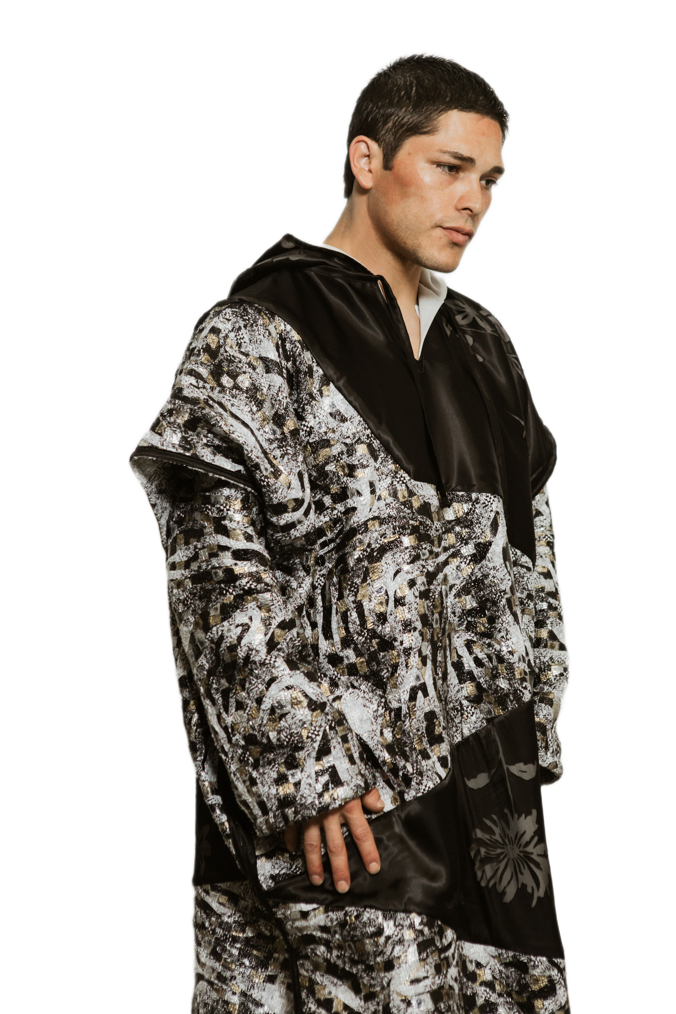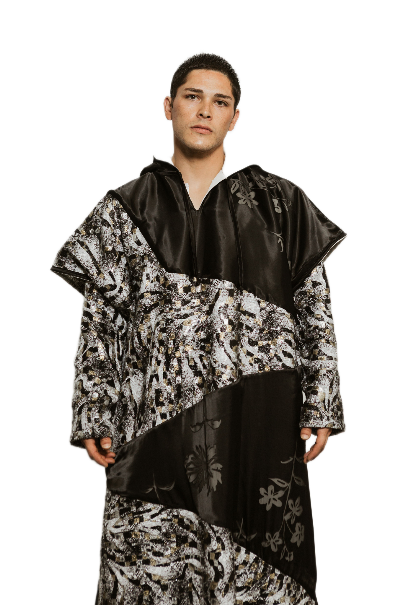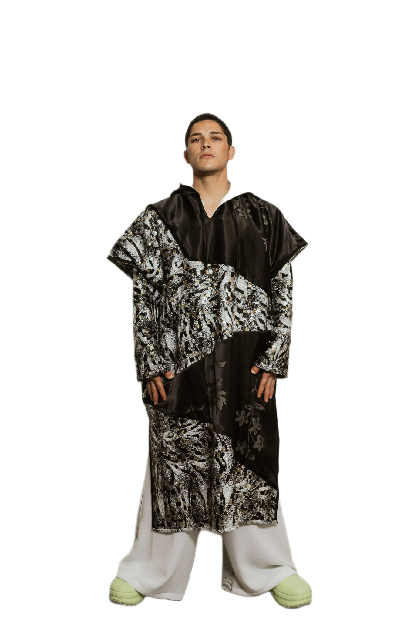 Long-line hooded kaftan in contrasting black satin and abstract monochrome jacquard silk panels. oversized fit with short sleeves and flowing silhouette.