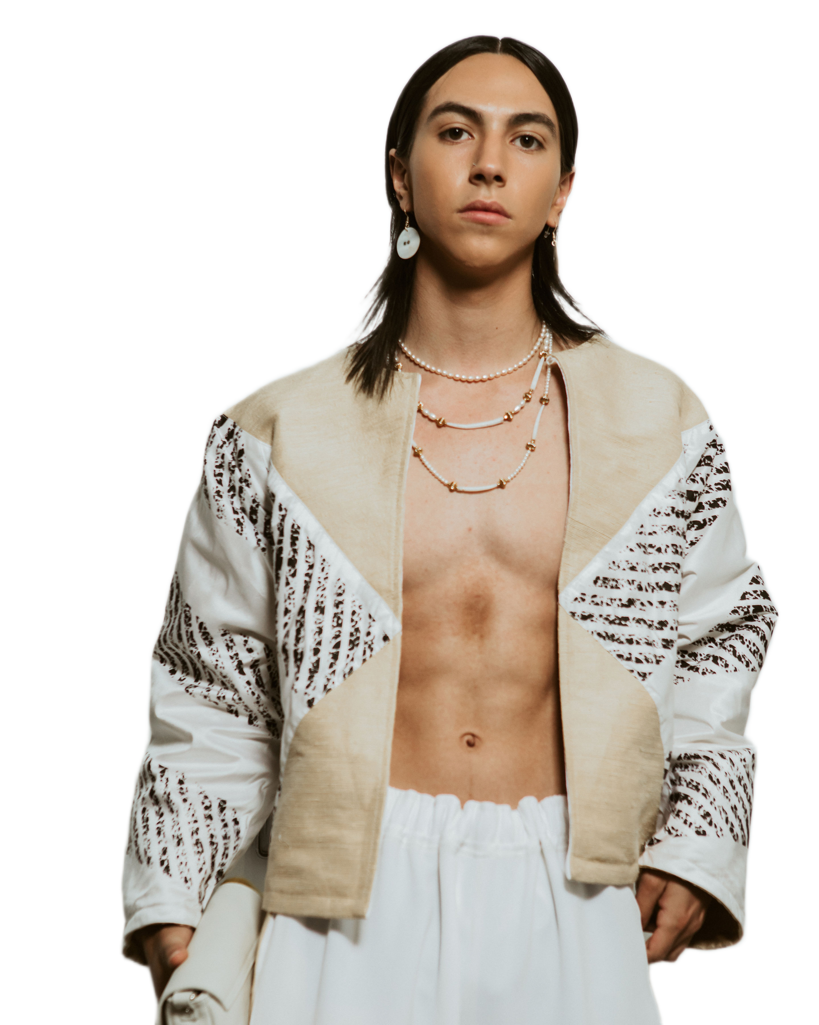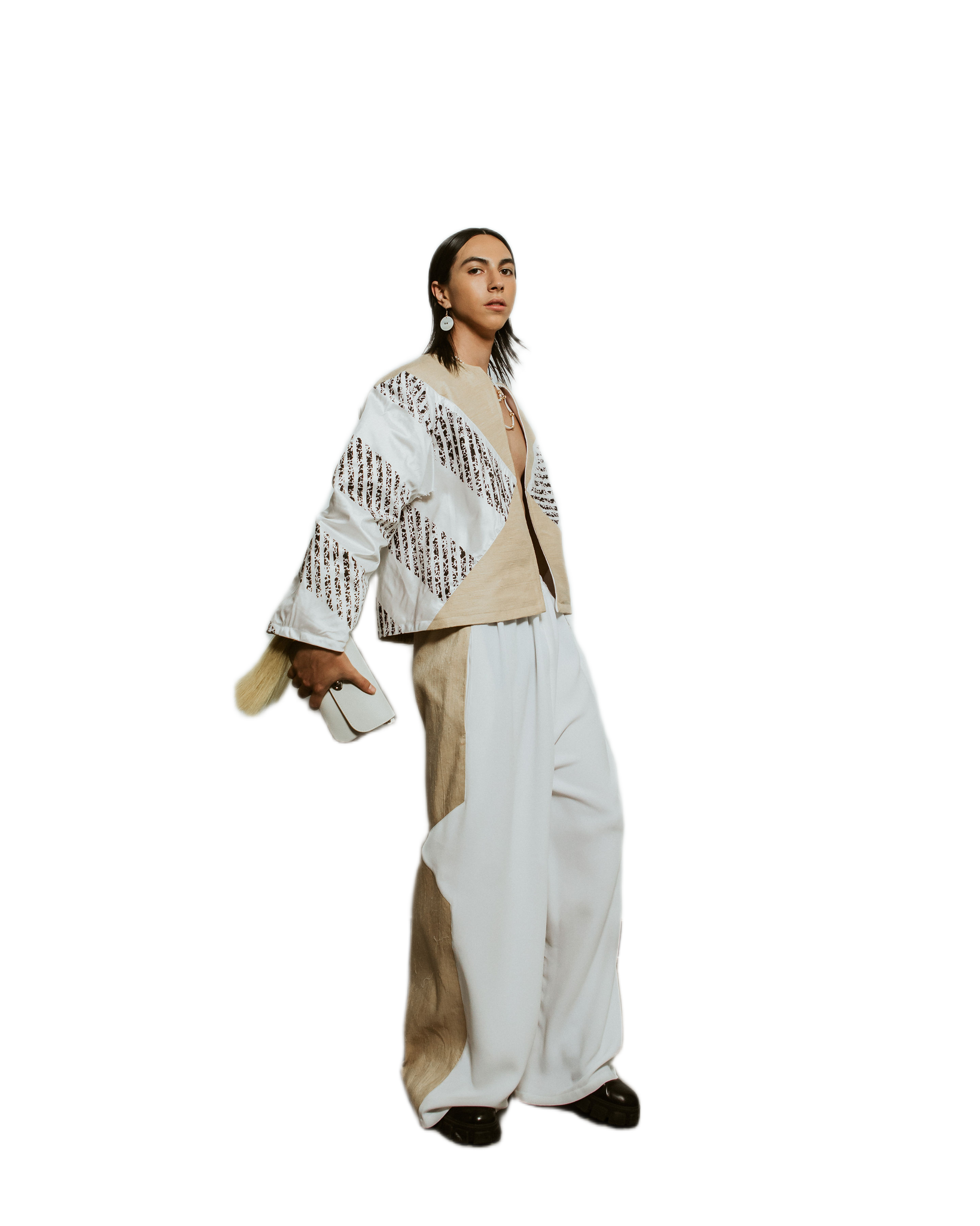 Structured collarless jacket in silk patchwork, featuring a geometric gold front panel and contrast white sleeves with black linear embroidery. tailored fit with an open front and cropped length.